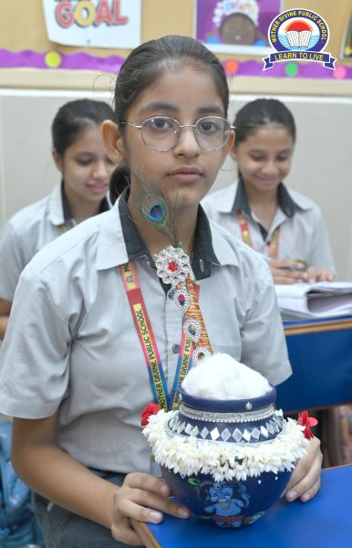 Students from classes VI to VIII decorated earthen pots in vibrant and imaginative styles, celebrating Lord Krishna’s playful and joyful spirit.The beautifully decorated pots were displayed in classrooms, adding a festive ambiance and visual celebration of the festival.