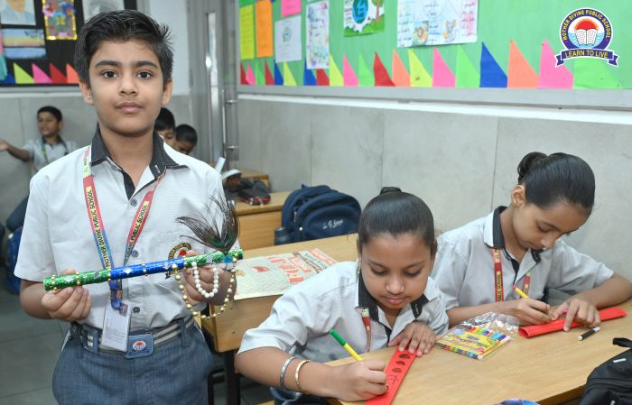 Students from class V actively participated in making flutes using paper to commemorate Lord Krishna’s love for music and art. The students displayed immense creativity and innovation while designing their flutes. The activity successfully combined cultural learning with hands-on creativity.