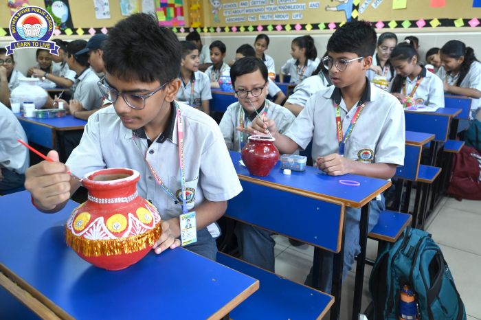 Students from classes VI to VIII decorated earthen pots in vibrant and imaginative styles, celebrating Lord Krishna’s playful and joyful spirit.The beautifully decorated pots were displayed in classrooms, adding a festive ambiance and visual celebration of the festival.